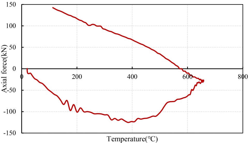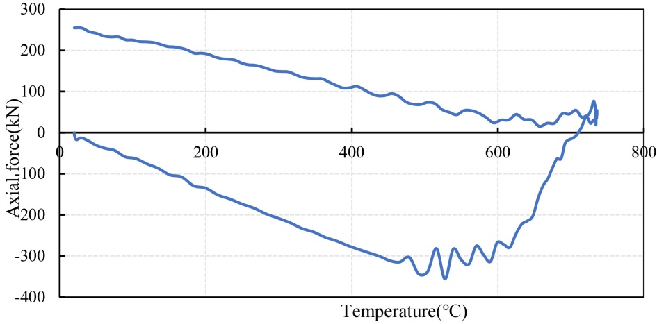 图1. 火灾条件下节点轴向内力的变化。(A) 强轴向约束;(B) 轴向延性连接
