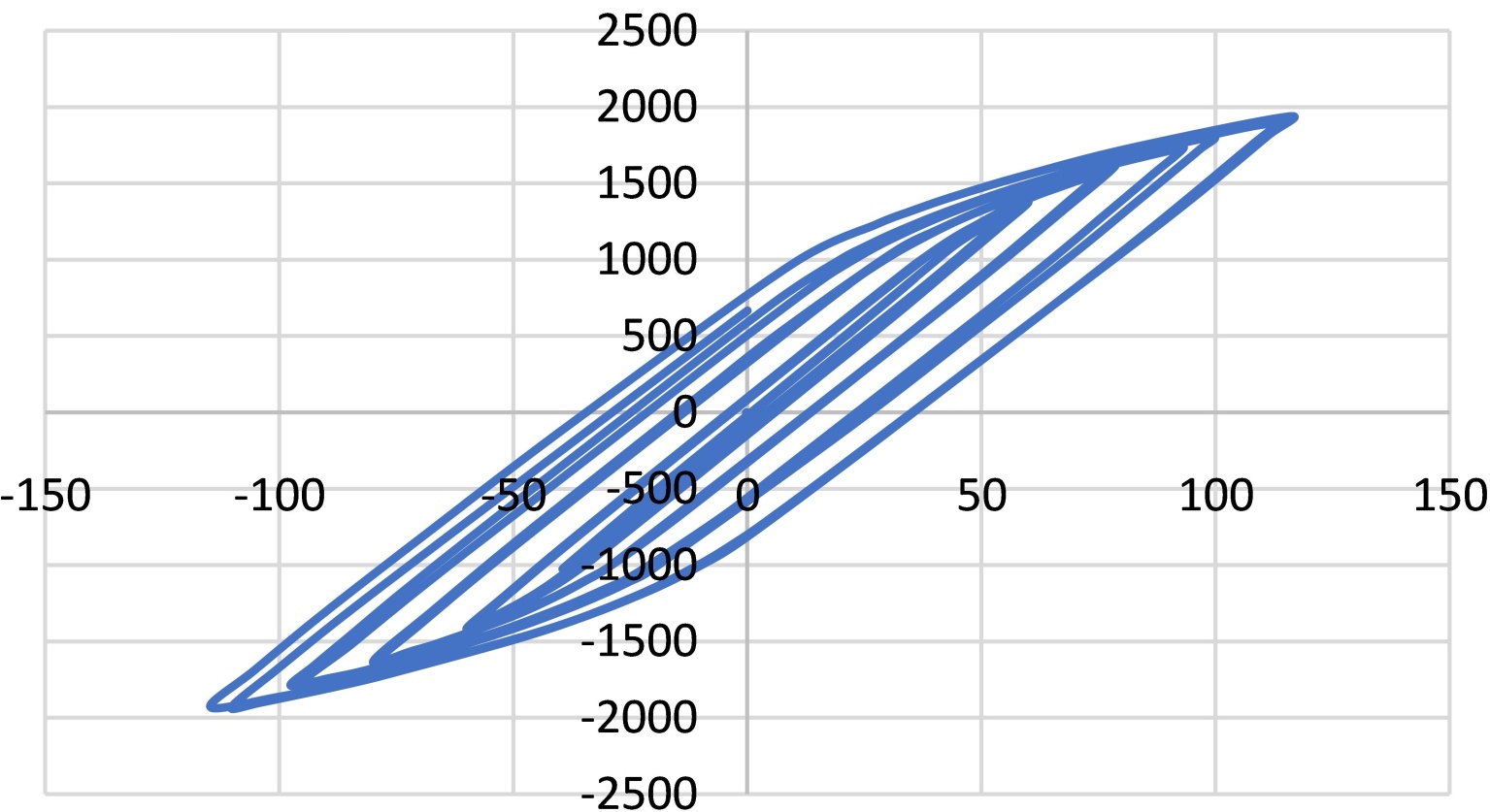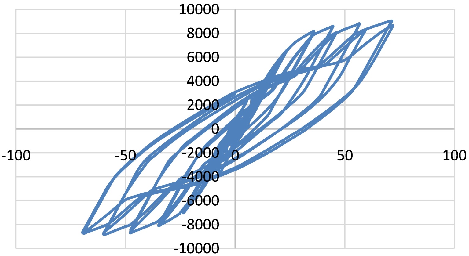 滞回曲线是评价反复荷载作用下延性节点耗能能力的核心依据。本节重点比较原型1 (图8)的滞回响应特性。原型2 (图9),并量化其耗能性能。图中的原型1。结果表明,延性节点的滞回曲线在加载初期呈“纺锤形”,随着加载次数的增加,包络曲线逐渐变小。当位移幅值达到±100时,曲线开始出现轻微的夹持效应,峰值荷载趋于稳定。这表明节点的半椭圆截面在循环荷载作用下逐渐进入塑性阶段,其优越性源于半圆形环形截面的多级耗能机制:弹性阶段提供稳定的刚度;塑性阶段通过均匀屈服分散应力;破坏阶段将裂缝限制在可替换区域,从而确保主体结构的安全。图9中的原型2显示了原型2的滞回曲线呈全纺锤形,在加载过程中没有明显的夹持效应。峰值载荷(约±10,000 kN)明显高于原型1,包络曲线随位移幅值的增大保持稳定的扩展趋势。这是因为角钢与半椭圆截面形成双承载体系:角钢承担部分循环荷载,降低了半椭圆截面的应力集中,避免了单一构件的过早塑性破坏。