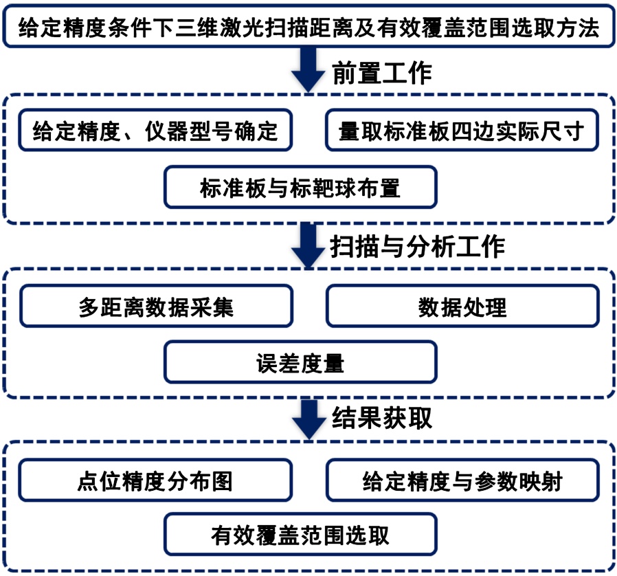 近年来,三维激光扫描(TLS)在装配式构件与钢结构尺寸核验中的应用迅速增长,但扫描距离、入射角与表面反射特性对结果精度影响显著,参数选择缺乏统一、可参考的准则仍是痛点[1]。面向工程约束的优化研究表明,可将距离、角度、分辨率等变量纳入多目标框架,兼顾精度与作业时间,给出更具鲁棒性的参数组合[2]。在工程构件级与轨道工程中,基于点云的尺寸快速检测与偏差评估已显示出效率与可追溯优势,为“精度–参数–结果”的关联提供案例[3]。隧道场景的大范围应用进一步揭示了数据获取条件与几何精度的耦合关系:一方面,以TLS为核心的整体变形分析流程强调参考基准与多期对比的可比性[4];另一方面,移动激光扫描(MLS)结合图像与强度等信息实现收敛直径的快速提取并通过测量对比验证精度[5]。在地铁运营巡检中,移动式三维激光扫描与AI识别的结合显著提升了缺陷识别与流程效率,也对最小站数、路径、满足精度指标的作业组织提出了量化依据[6]。面向构件高精度建模与尺寸核验,NURBS等曲面拟合与特征提取为“从点到量”的指标生成提供了稳定管线[7];而在GNSS受限环境下,通过靶标控制与多传感器约束可获得绝对坐标系下的高精度点云,保证参数到结果映射的可落地性[8]。国际研究在扫描几何作用机制与多机型性能评估方面提供了方法学基底,使扫描距离与入射角度对点云质量的影响机理得到系统阐释[9],多款3D LiDAR的性能差异亦被量化,为工程参数外推与设备选型提供参照[10]。在上述的研究基础上,本文提出一套在给定精度条件下确定扫描距离与有效覆盖范围的通用方法。通过标准化标定和多距离数据分析,建立目标精度与扫描距离、有效覆盖范围之间的映射关系,通过精度分布图直观呈现,形成可复现的参数选取准则,避免了人为选择扫描参数的主观性和盲目性造成的精度不达标问题,提高扫描作业的工作效率。技术路线图见图1。
