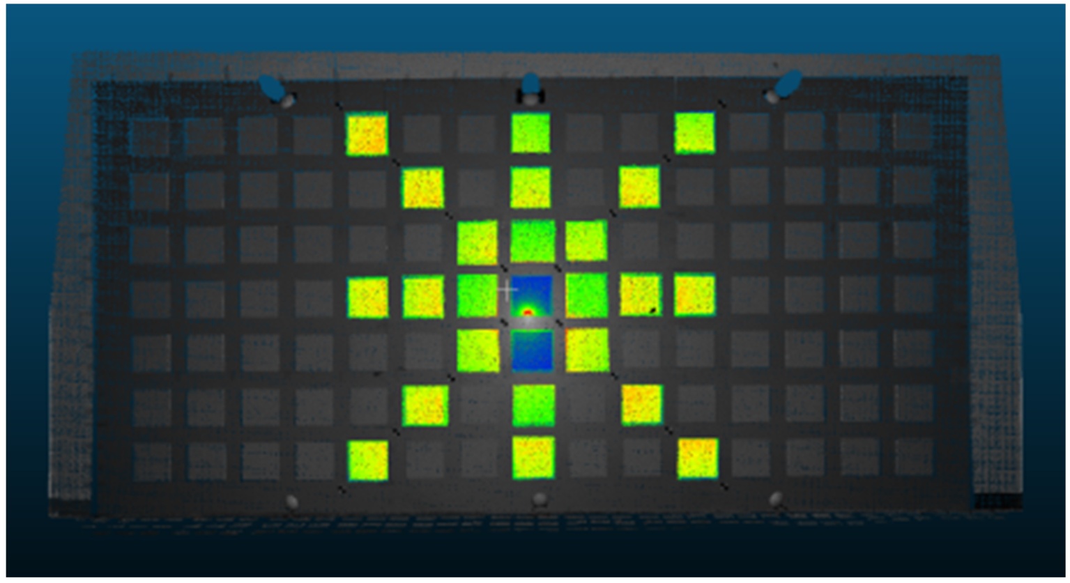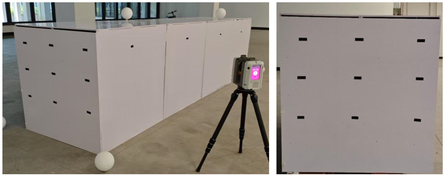 采用标准板作为标定目标,以降低镜面反射、保证几何稳定。示例规格为300 mm × 300 mm × 20 mm,试验在室内无遮挡、无强气流、无直射光的浅色背景环境进行,以获得稳定回波与清晰边界。标靶球按三球一组布置,置于标定区域中心及两侧,三球等高;中心球用于统一坐标与瞄准,两侧两球用于配准与精度复核;当场地较长时可沿长向等距增设1~3组以增强全局约束。标准板按矩阵粘贴,示例为15 × 7行列,板间距150 mm,矩阵中心与扫描视轴对正;粘贴方式采用背胶或磁吸,保证平整并便于拆装。本示例共粘贴105块标准板,可覆盖近距到中远距视场并表征由中心向边缘的精度梯度。以上配置仅为示例,可根据目标精度、设备型号与场地条件,灵活调整标准板尺寸与数量、板间距以及标靶球组数与位置。三维建模图与示例试验照片见图2(a)、图2(b)。