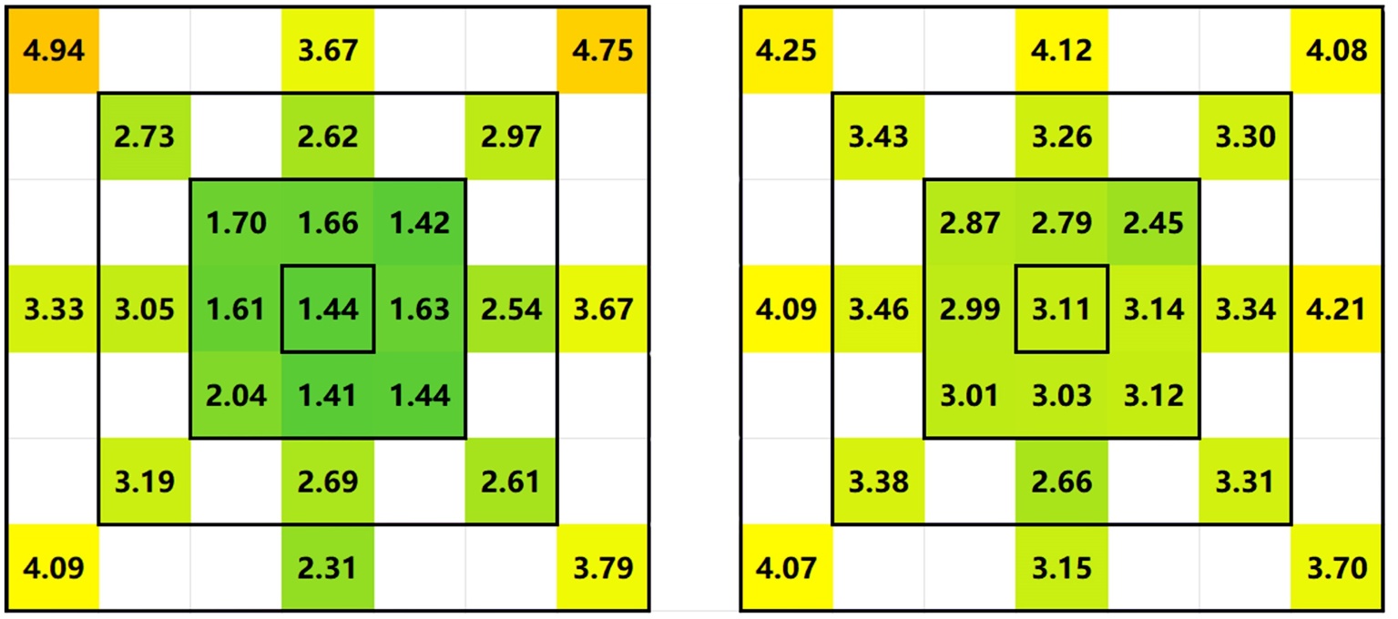 参考2.3小节的流程,将1 m、2 m、3 m、4 m典型距离下的各点位标准板的平均精度映射到板阵平面,得到各扫描距离下点位精度分布图,见图6,图中的数字代表该点位的尺寸精度误差,单位为毫米,通过从绿到红的颜色变化反映精度的变化。可以看出,随着扫描距离的增加,误差逐渐扩大,整体精度呈下降趋势。1 m和2 m近距离条件下,中心区域的平均误差主要集中在1.41 mm~3.14 mm之间,表现出较高的精度和良好的稳定性,而边缘区域的平均误差明显偏大,大致在2.31 mm~4.94 mm之间。3 m和4 m的较远距离下,绿色高精度区域明显减少,误差范围增大到约3.63 mm~5.87 mm,表明扫描仪在远距离条件下的测量精度受到显著影响。