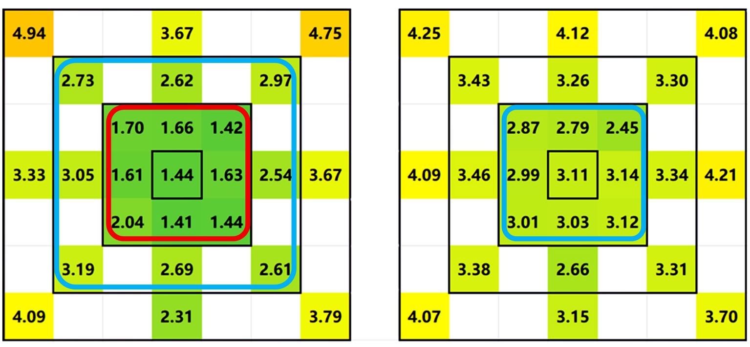 为在工程条件下客观描述扫描精度,提出以标准板为度量单元,通过各点位标准板的平均尺寸误差来表征该点位误差。具体做法包含两次平均:其一,对相同点位进行多次独立测量,计算多次结果的平均值,用以削弱单次测量的随机波动;其二,在每次测量中取该点位标准板四条边的尺寸误差求平均,以减小单边局部噪声对结果的影响。两次平均后的数值作为该点位的代表性误差,能够有效降低偶然误差、提升统计稳定性与可比性,并为后续的距离映射、有效覆盖范围确定以及现场参数选取提供可靠输入。后续将通过示例介绍本方法。