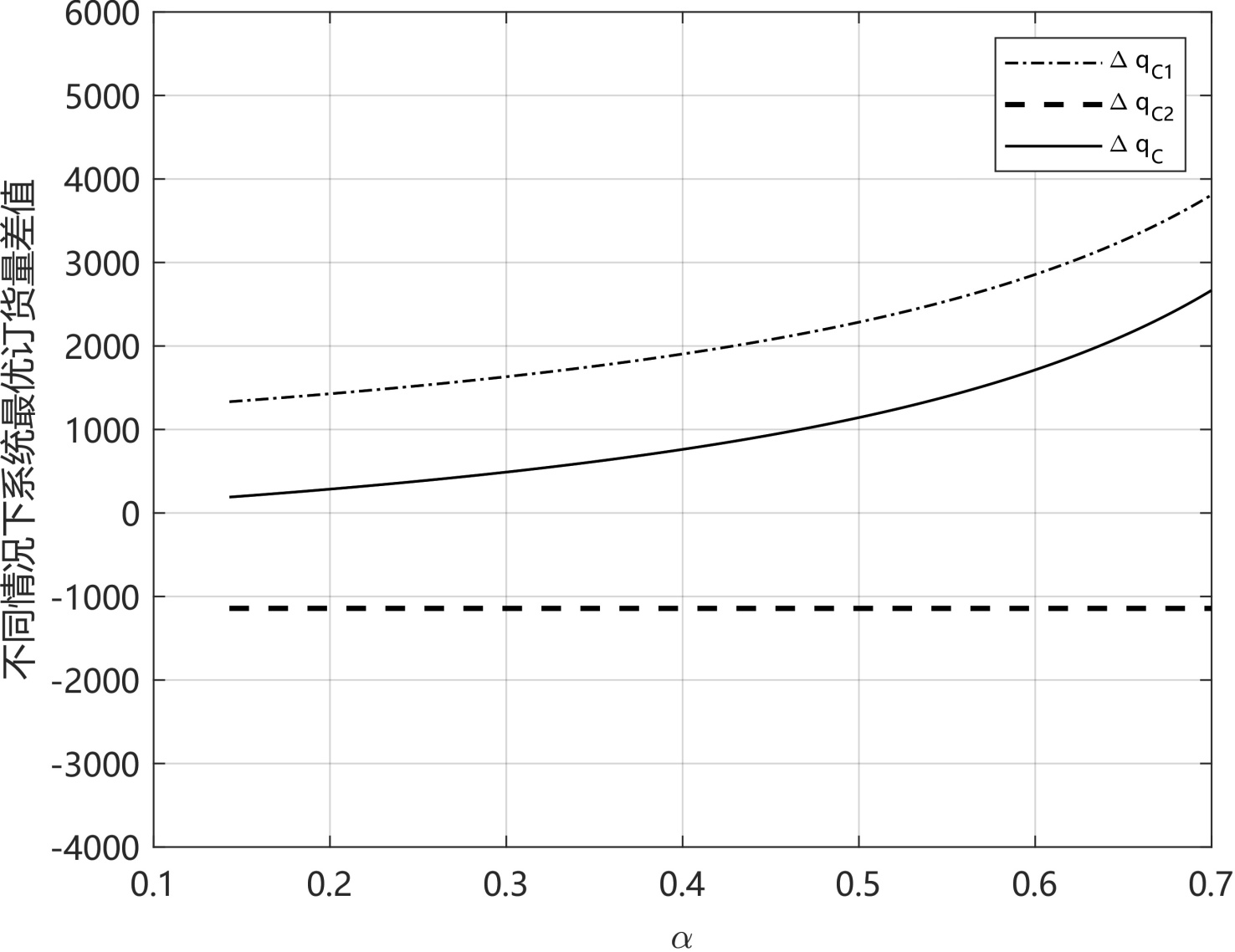 图4结果表明,在系统决策下,投保相对于不投保的总订购量差值在研究区间内始终为正,且随中断概率