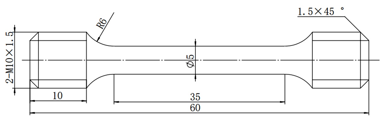 铸板经表面铣削后,从铸板上取Φ10 × 70 mm的圆棒。然后加工成M10Φ5的标准拉伸棒,在室温下进行拉伸实验测试力学性能。横梁的初始位移速度为0.5 mm/min,每组3个平行试样,测试结果均采用平均值表示。室温拉伸试样尺寸、测量方法和数据处理均按照GB/T228.1-2021《金属材料 拉伸试验 第1部分:室温试验方法》进行。拉伸试样尺寸示意图见图1。