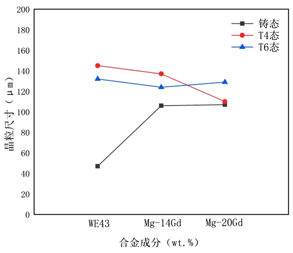 1. 稀土含量对铸造镁合金的显微组织具有显著调控作用:随稀土含量增加,铸态合金中第二相体积分数递增,晶粒尺寸呈现增加的趋势(WE43-铸态:47 μm→Mg-14Gd-铸态:106 μm→Mg-20Gd-铸态:107 μm);固溶处理后,第二相大量溶解,晶粒普遍长大,且高稀土含量合金晶粒长大幅度更小(Mg-20Gd-T4: 110 μm)。