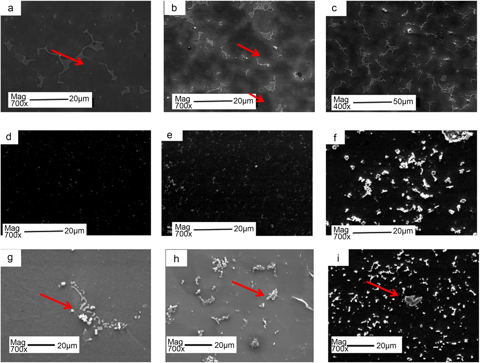 图4. 三种合金热处理前后的扫描电镜显微组织;(a) WE43-铸态;(b) Mg-14Gd-铸态;(c) Mg-20Gd-铸态;(d) WE43-T4;(e) Mg-14Gd-T4;(f) Mg-20Gd-T4;(g) WE43-T6;(h) Mg-14Gd-T6;(i) Mg-20Gd-T6