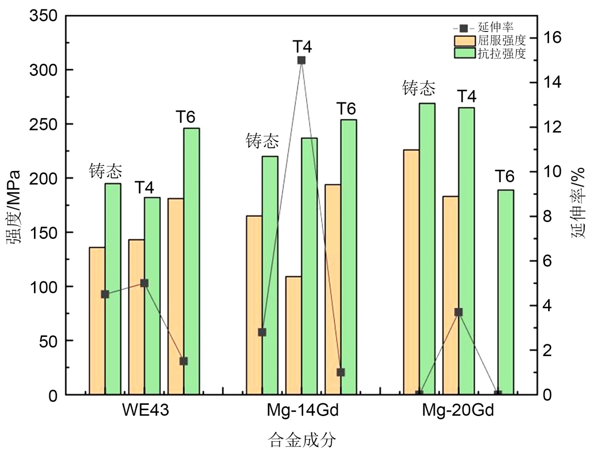 综合考虑强度与塑性,中高稀土含量的Mg-14Gd合金经固溶处理后可获得更优的综合力学性能,更适用于对强度与塑性均有要求的工程场景;超高稀土含量的Mg-20Gd合金则适用于对强度要求极高、对塑性要求较低的特殊领域。