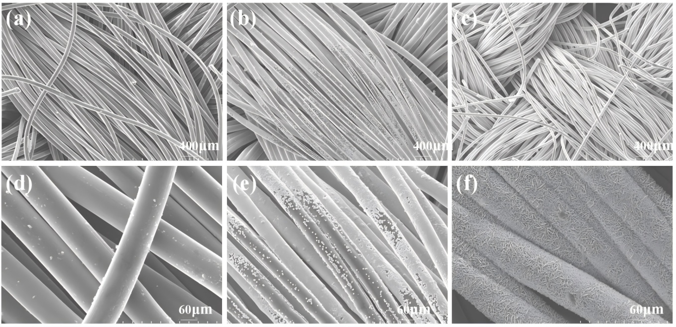 图1. NCL/HCC-1000s的((a), (d)) SEM图像;NCL/HCC-1500s的((b), (e)) SEM图像;和NCL/HCC-2000s的((c), (f)) SEM图像