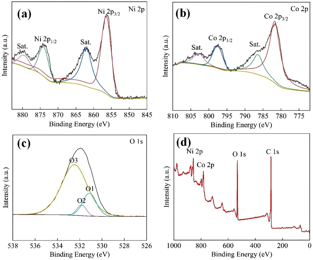 Figure 3. XPS spectra: (a) Ni spectrum; (b) Co spectrum; (c) O spectrum; (d) survey spectrum