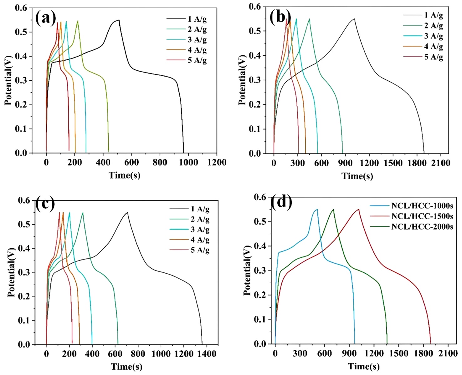 图5. 不同电流密度下的GCD曲线(a) NCL/HCC-1000s;(b) NCL/HCC-1500s;(c) NCL/HCC-2000s和(d) 1 A/g GCD曲线对比图