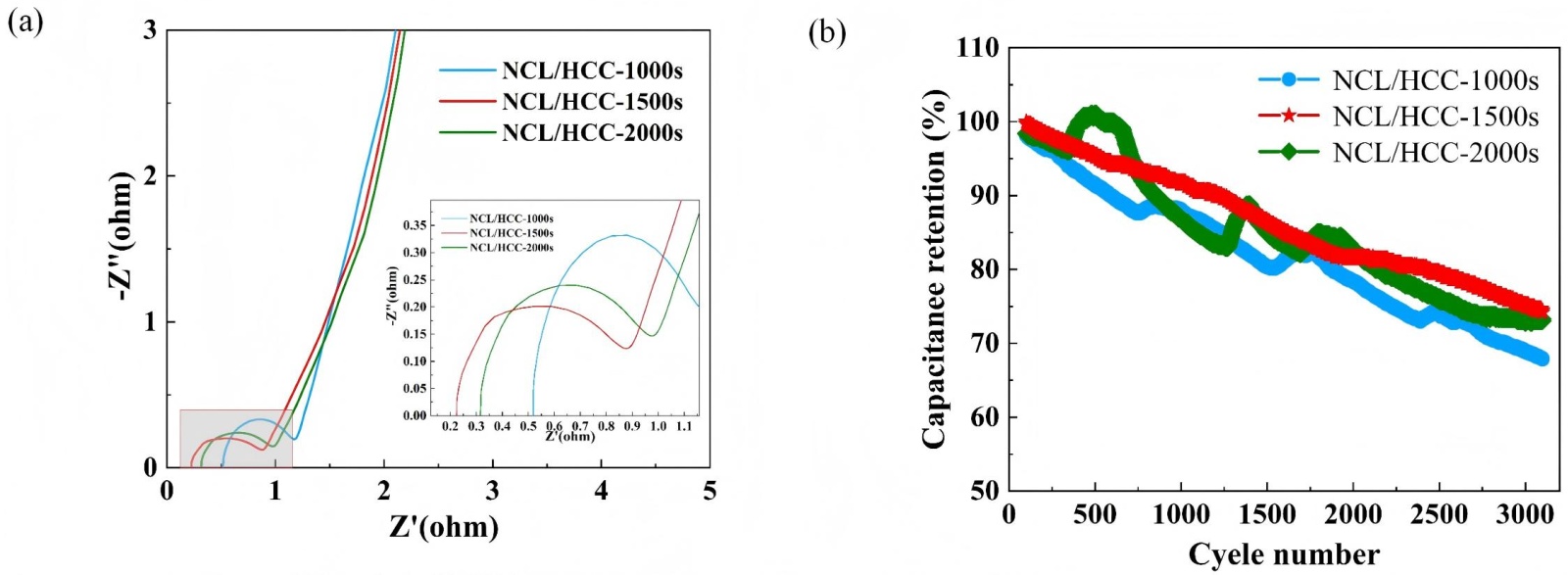 图6(b) HCC复合材料在电流密度5 A/g下,历经3000次充放电的循环实验稳定性曲线。如图所示,NCL/HCC-1500s的电容在经过3000次充放电循环实验后容量保持率最高为74.7%,而较长的电沉积时间(2000 s)导致了材料的电容衰减增加,这可能是由于晶体结构不均匀、表面缺陷增多或电解液渗透性下降等问题,进而影响了材料的电化学稳定性。不同电沉积时间下复合材料长循环后的容量保持率如表2所示。