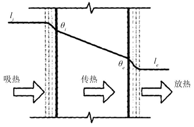 在建筑热工中,热桥属于致使围护结构保温性能出现失效状况的关键因素里的一个,它的形成原理是扎根于材料物理特性和构造设计之间所存在的矛盾,其本质实际上就是围护结构里热量传递的一条“异常通道”。热桥的本质在于导热性能存在“不均匀性”,建筑围护结构中的特殊部位材料的导热系数比周边区域高,使得热量传递效率变得异常高,像钢筋混凝土梁柱、金属窗框以及阳台板和墙体的连接处等,因为材料本身的特性,都成了热量传导的“高速通道”[6]。建筑墙体的传热过程包括表面吸热、内部传热与表面放热,由于建筑围护结构始终受室内和室外热作用的影响,因而热量总是不断地从建筑围护结构传入或传出。热量传递的方向与室内外温度的相对高低有关系,热量总是由温度高的地方传向温度低的地方,若室内温度比室外温度高,热量就会由室内通过建筑墙体传到室外,这种情况一般发生在寒冷的冬季,若室内温度比室外温度低,那么热量就会由室外通过建筑墙体传到室内,这种情况则一般发生在炎热的夏季。通过围护结构所需经过的三个具体过程,如图1所示。