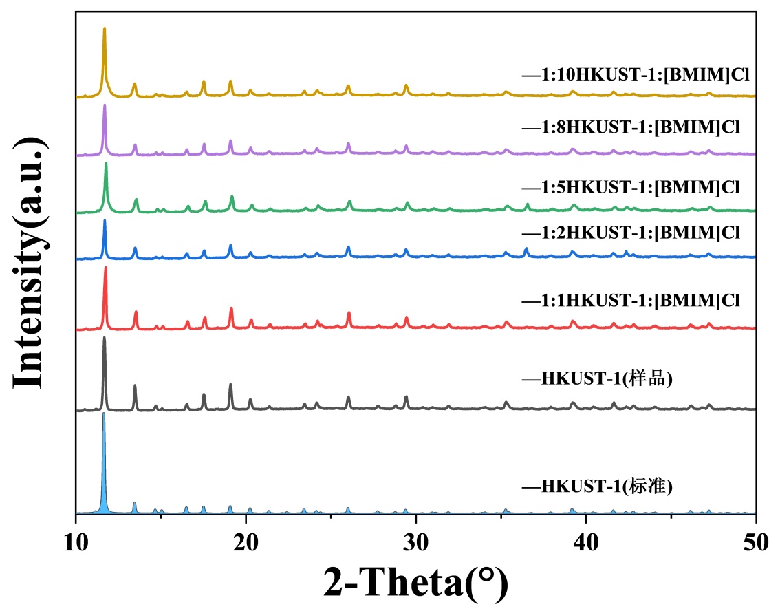 图1. HKUST-1、不同比例HKUST-1:[BMIM]Cl样品和HKUST-1标准谱图的XRD对比图