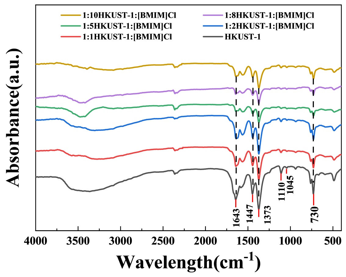图2. HKUST-1和不同比例HKUST-1:[BMIM]Cl样品的红外谱图