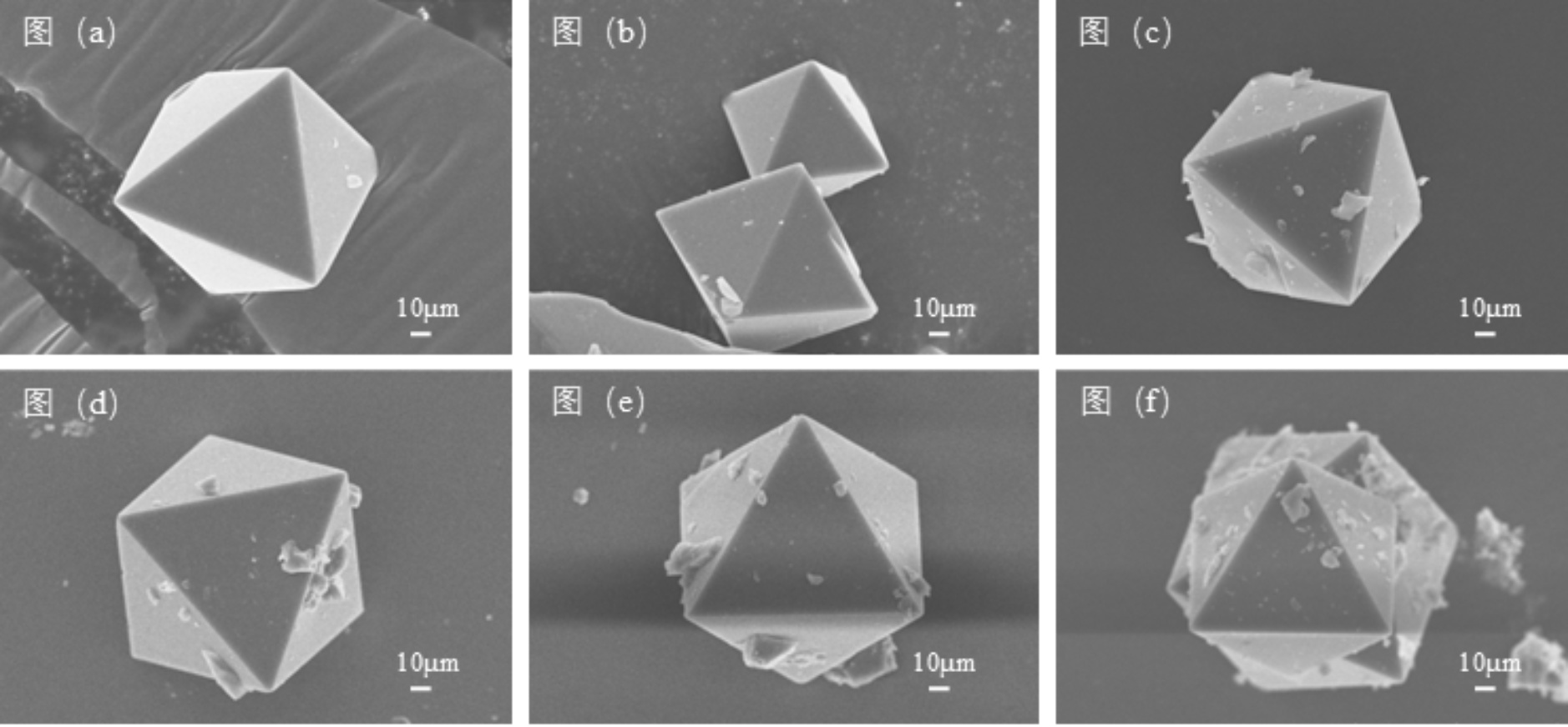 图3. (a) HKUST-1和不同比例HKUST-1:[BMIM]Cl样品((b) 1:1, (c) 1:2, (d) 1:5, (e) 1:8, and (f) 1:10)的SEM图谱