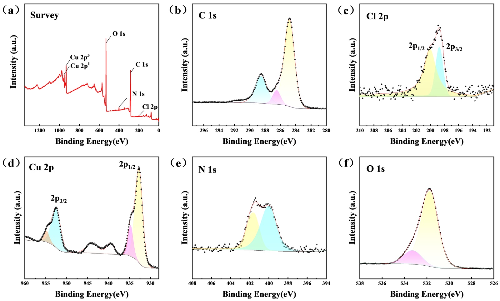 图4. 1:2HKUST-1:[BMIM]Cl样品的XPS能谱:(a) Survey,(b) C1s,(c) N1s,(d) O1s,(e) Cl 2p,(f) Cu 2p