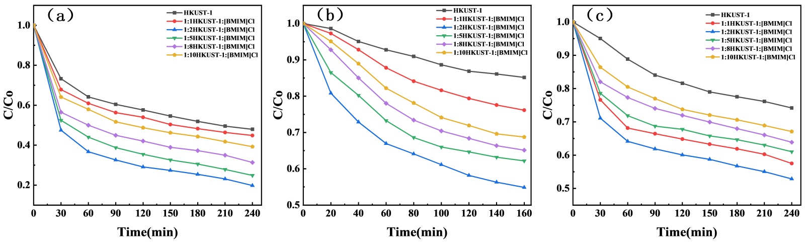 图7. HKUST-1和不同比例HKUST-1:[BMIM]Cl的可见光降解情况图:(a) 燃油脱氮;(b) 亚甲基蓝;(c) 罗丹明B