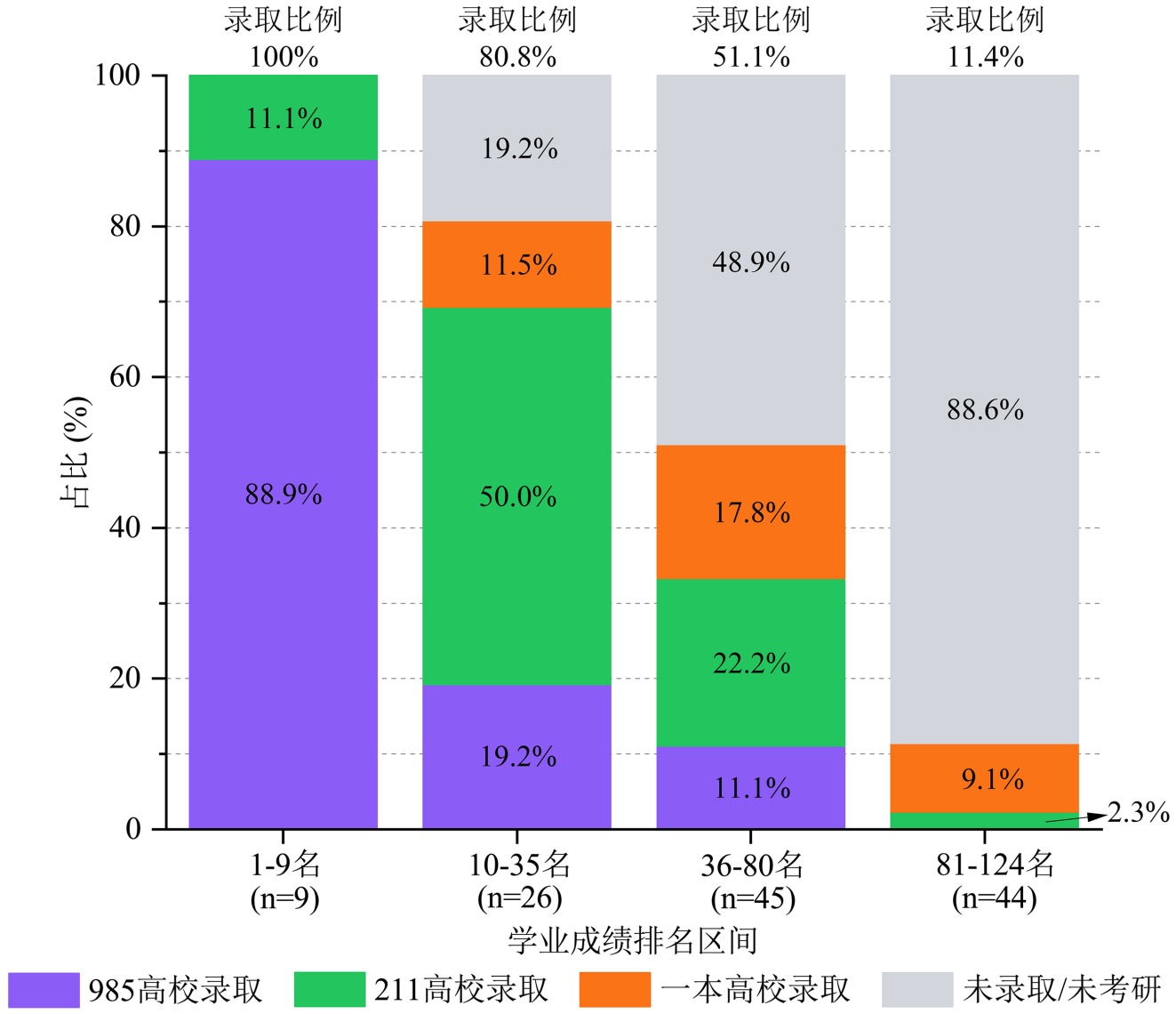 图2. 不同学业成绩排名区间学生的研究生录取结果分布