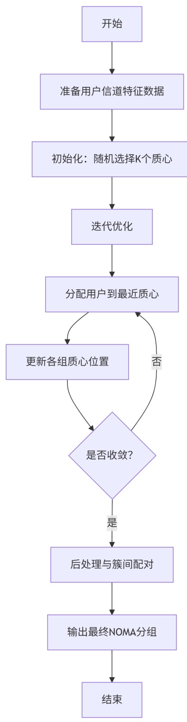 这样的迭代过程循环进行,每次迭代都会产生更合理的用户分组和更准确的质心位置,直到满足预先设定的收敛条件,此时算法认为已经找到了最优的组划分方案。迭代终止后,算法还会执行必要的后处理操作,包括检测是否存在未分配任何用户的空组,并通过从规模最大的组中迁移合适用户的方式来消除空组,确保每个组都包含有效用户。在完成聚类分组后,为保证NOMA组内用户的信道差异性,我们采用簇间配对的方法,将每个簇作为一个用户池,从不同簇中选取用户组合成NOMA组。具体而言,如果聚类数等于每组用户数,可以通过从每个簇中各选择一名用户来构建每个NOMA组。这样,每个组内的用户信道条件来自不同簇,显著提高了组内的信道差异性。最终,算法输出稳定可靠的用户分组方案,为后续的NOMA功率分配提供优化基础。算法流程如下图2所示。