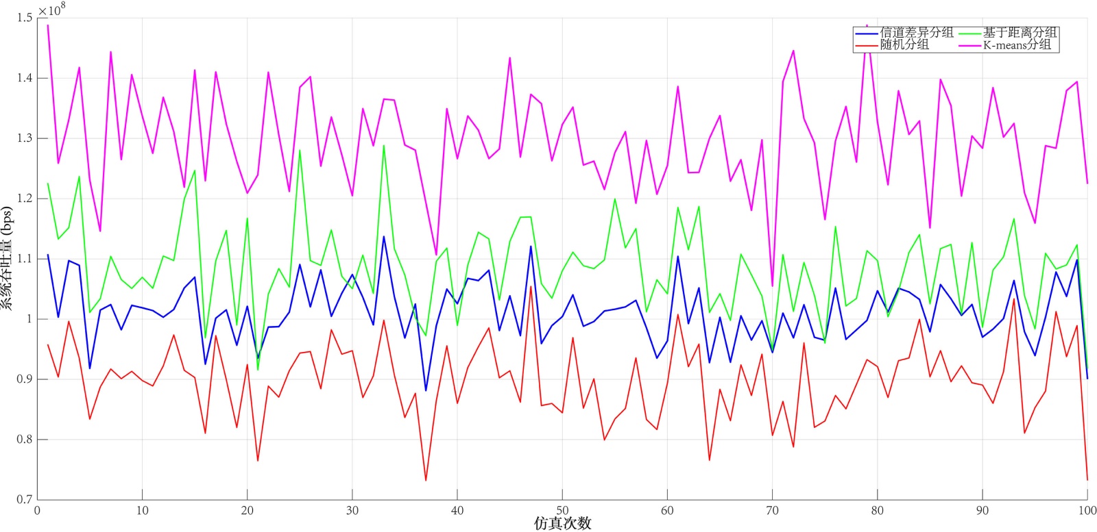 图4展示了不同用户分组策略下系统吞吐量随仿真迭代次数的变化对比。从图中可以清晰地观察到,本文所提算法如图中粉红色曲线所示,始终显著优于其他方案,实现了最高的系统吞吐量,充分验证了其核心优势。各算法的性能层次分明,所提方法性能最优,其次为基于距离的用户分组方案,再次是基于信道差异的分组方法;而随机分组策略的性能最低,这与理论预期完全一致。该排序结果证明,所提方法通过更合理的聚类与资源分配机制,能更充分地挖掘系统容量潜力。尽管曲线在迭代过程中存在预期内的波动,但所提算法整体上展现出强劲的性能提升和良好的收敛趋势,其吞吐量增益在整个迭代过程中均保持领先。该结果有力地表明,所提策略具有重要的研究价值。