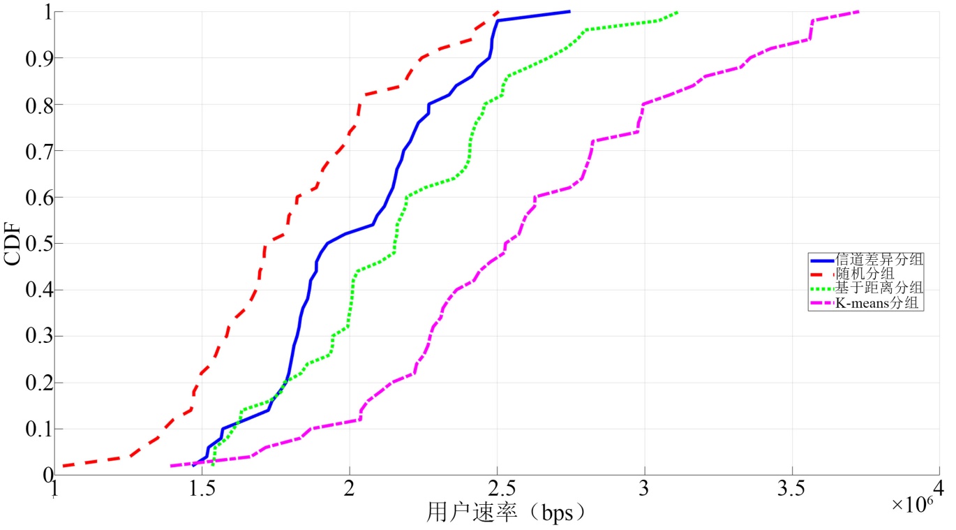 图5展示了不同用户分组策略下的用户速率累积分布函数对比。可以明显看出,基于K-means聚类算法的分组方案在整个速率区间内均优于其他方法,其CDF曲线整体靠右,表明用户享有更高的传输速率。这一结果与图4中所呈现的系统高吞吐量性能高度一致,再次验证了K-means分组策略在提升系统整体与个体性能方面的双重优势。具体而言,在任意相同用户百分比下,所提算法对应的用户速率值最高;反之,在任一速率阈值上,该算法能服务更多的用户,显著改善了用户体验。K-means分组表现最佳,其后依次是基于距离的分组、基于信道差异的分组,而随机分组性能最弱。该对比充分证明了所提方法的有效性和优越性。