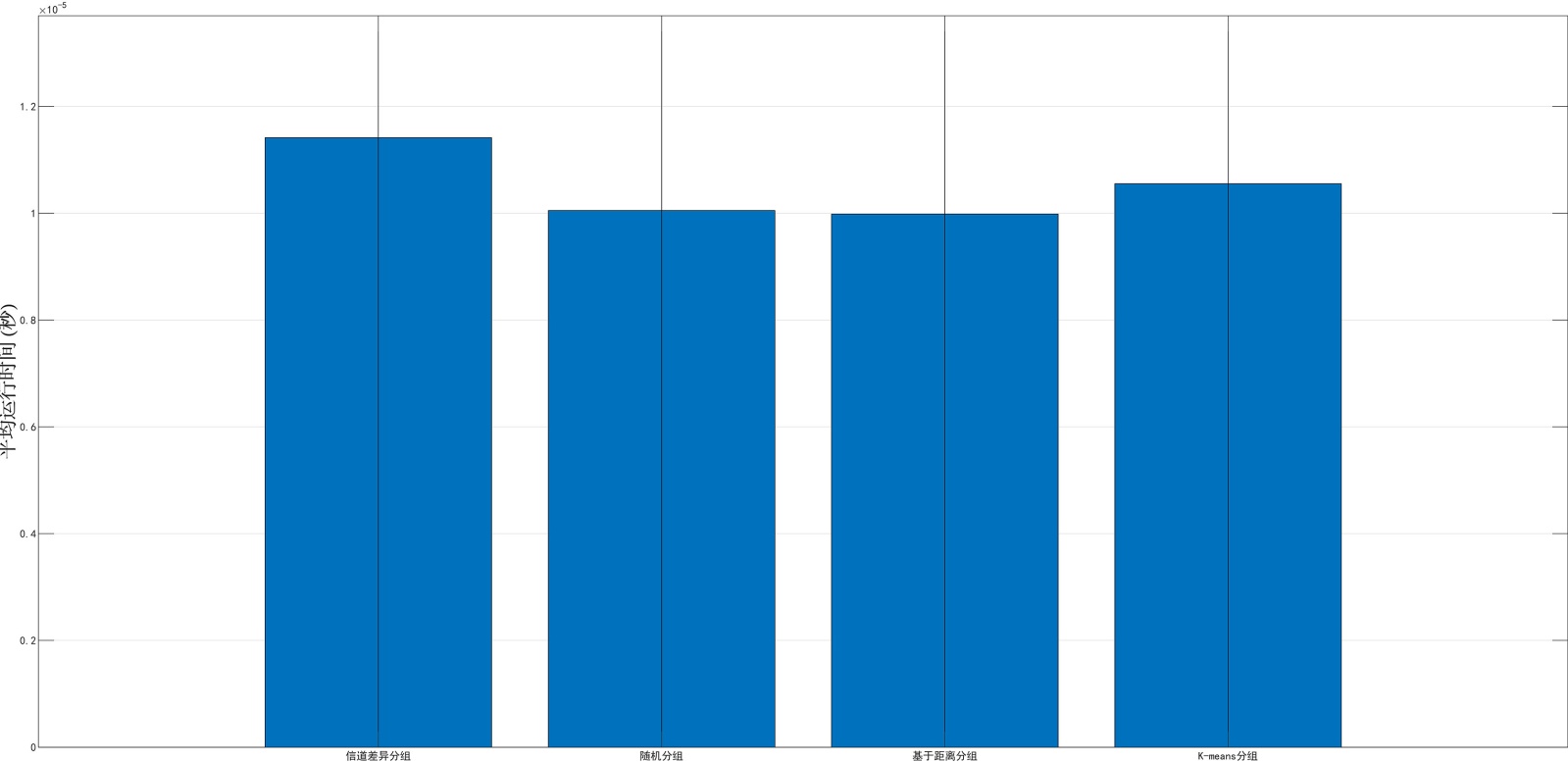 图7对比了不同用户分组算法的运行时间。从计算结果来看,本文所采用的K-means聚类算法的运行时间高于计算复杂度较低的随机分组与基于距离的分组方案,但显著低于基于信道差异的分组方法。运行时间的差异直接反映了各算法在计算复杂度与性能之间的权衡。随机分组与基于距离的分组虽然计算速度最快,但其在系统吞吐量和用户速率方面的性能较差如图4、图5所示。本文所提的K-means算法通过适中的计算开销,换取了系统吞吐量和用户速率的显著提升,实现了性能与复杂度之间的良好平衡。值得注意的是,基于信道差异的分组方案虽然获得了最佳的公平性如图6,但其计算复杂度最高,运行时间最长。相比之下,本算法以远低于其他方案的计算耗时,获得了综合更优的性能表现,体现了更高的实用性和算法效率。