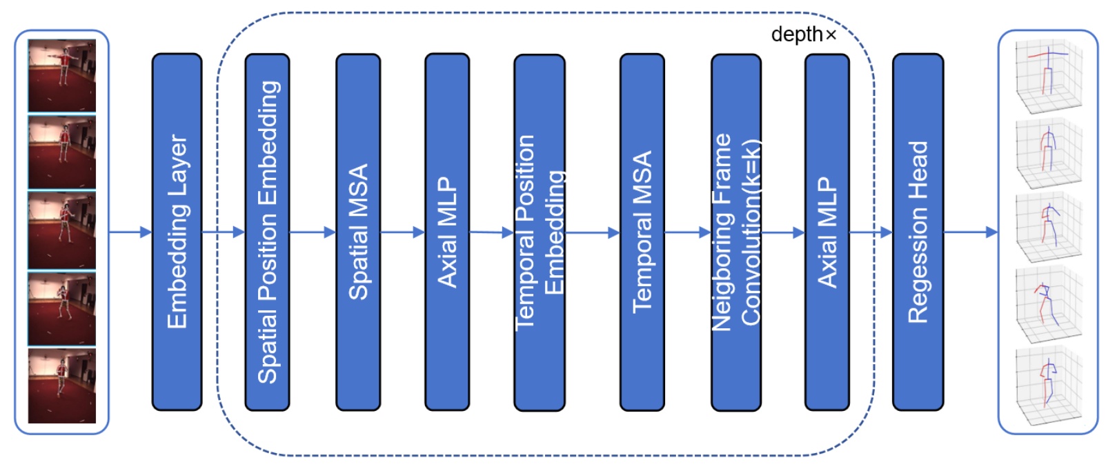 本文提出了一种新颖的近邻卷积Transformer (NCFormer),用于单目视频中的三维人体姿态估计。NCFormer的核心创新在于其近邻帧依赖捕捉机制:一方面,通过轴向卷积显式地聚合局部近邻帧的时空特征,以捕捉运动连续性与短程依赖;另一方面,通过轴向多层感知机对时间与空间维度进行解耦建模,避免跨维度信息干扰,从而增强特征的结构化表示能力。