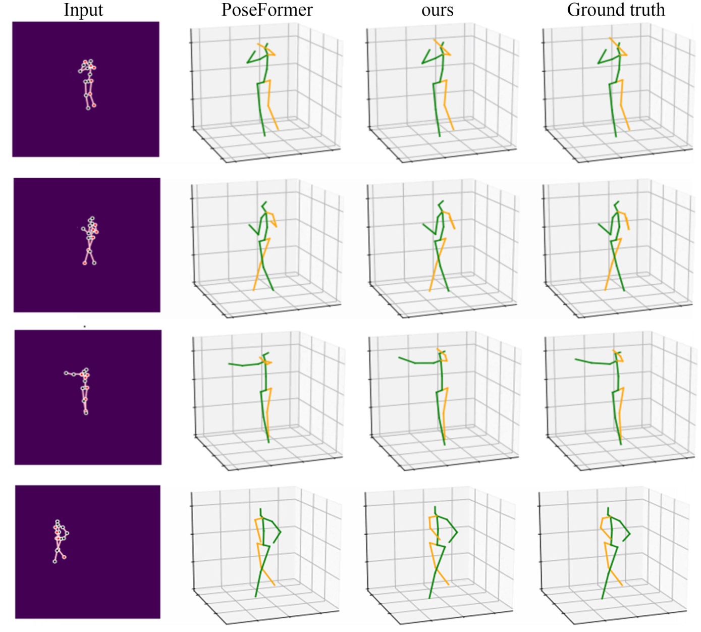 我们进一步通过定性可视化来验证所提NCFormer模型在三维人体姿态估计上的有效性,从Human3.6M测试集中随机选取若干样本,将NCFormer的三维姿态重建结果与图4中有代表性的Transformer方法PoseFormer结果进行对比。可视化结果清晰表明,在所有动作类别中,NCFormer预测的三维关节位置均更接近真实姿态。相较于其他模型,本方法在肢体长度一致性、关节连接平滑度以及整体结构合理性方面均表现更优。上述可视化结果表明,NCFormer通过有效建模近邻帧依赖关系,显著提升了姿态估计的准确性与鲁棒性。