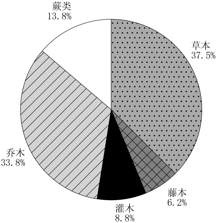 其中蕨类植物5科,6属,11种;乔木植物12科,21属,27种;灌木植物5科,5属,7种;藤本植物2科,2属,5种;草本植物7科,13属,30种;具体比例见图1。