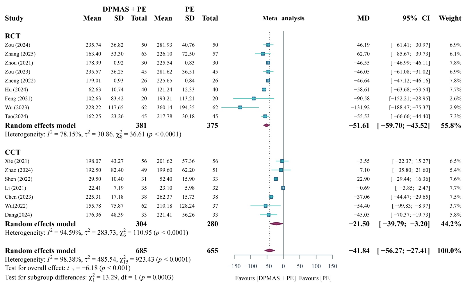 Abstract: Objective: To evaluate the clinical efficacy and safety of double plasma molecular adsorption system (DPMAS) combined with plasma exchange (PE) in the treatment of acute-on-chronic liver failure. Methods: PubMed, Embase, The Cochrane library, China National Knowledge Infrastructure database, VIP database and WanFang Medical Network were searched. Randomized controlled trials (RCT) and clinical controlled trials (CCT) of DPMAS combined with PE in the treatment of acute-on-chronic liver failure were included. The search was up to August 2025. The literatures meeting the inclusion criteria were screened and refined. The first author’s name, research objects, intervention measures, treatment outcomes and other indicators of the included literatures were mainly extracted. Meta-analysis was performed using R 4.5.1 software. Results: Nine RCTs and eight CCTs were included, with a total of 1452 patients. Among them, there were 734 cases in the DPMAS + PE combined treatment group and 718 cases in the PE single treatment group. Meta-analysis showed that the serum total bilirubin [MD = −41.84, 95% CI (−56.27, −27.41), P < 0.05], alanine aminotransferase [MD = −44.16, 95% CI (−68.15, −20.18), P < 0.05], interleukin-6 [MD = −6.47, 95% CI (−9.01, −3.92), P < 0.05], incidence of adverse reactions [RR = 0.48, 95%CI (0.34, 0.67), P < 0.05] and short-term survival rate [RR = 1.21, 95% CI (1.11, 1.33), P < 0.05] in the DPMAS + PE combined group were all better than those in the PE group, and the differences were statistically significant; there were no statistically significant differences in prothrombin activity [MD = 8.06, 95% CI (−0.77, 16.88), P > 0.05] and platelets [MD = 0.16, 95% CI (−5.05, 5.37), P > 0.05] between the DPMAS + PE combined group and the PE group. Conclusion: Compared with PE alone, DPMAS + PE combined treatment can significantly reduce the total bilirubin, alanine aminotransferase and interleukin-6 in patients with acute-on-chronic liver failure. There is no significant difference in the improvement of platelets and prothrombin activity between the two methods. It can reduce the incidence of adverse reactions and improve the short-term survival rate of patients.