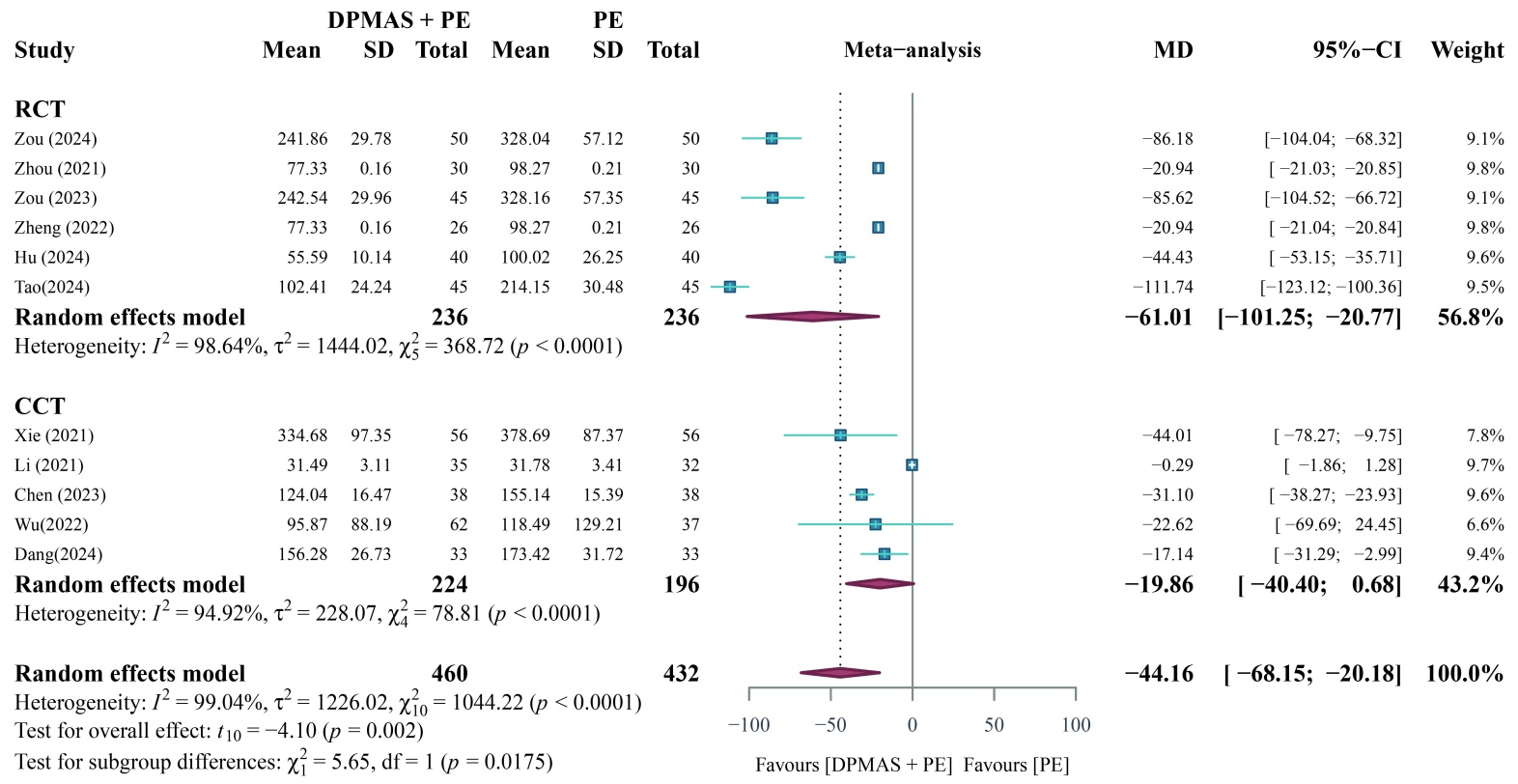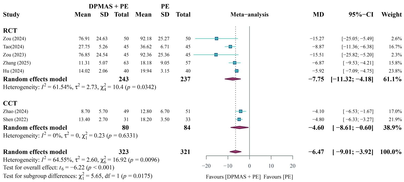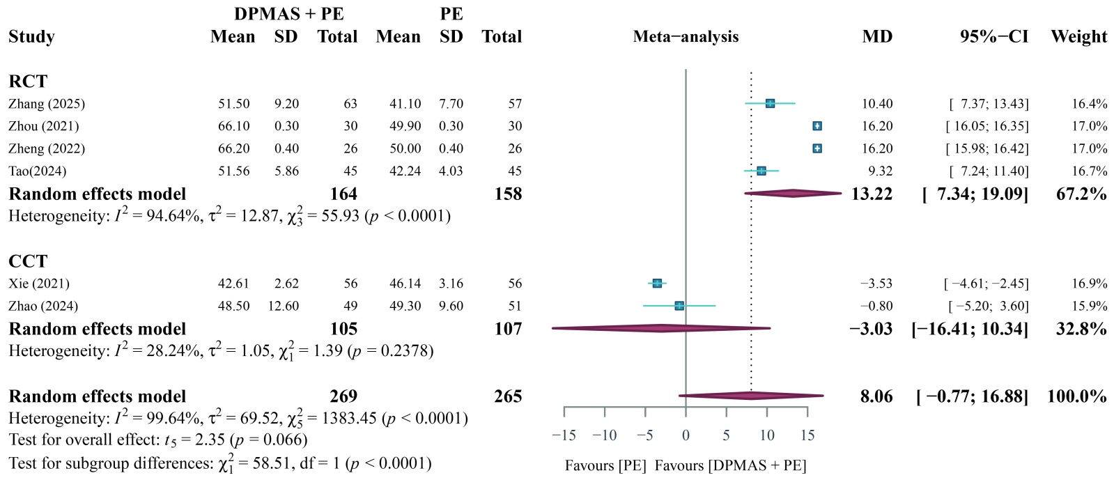 共有6篇文献[11] [12] [14] [16] [17] [24]研究了PTA治疗前后变化水平,各研究之间存在显著异质性(P < 0.1, I2 = 99.64%),采用随机效应模型分析,随机效应模型Meta分析结果显示,DPMAS + PE联合治疗组与单纯PE治疗后PTA相比差异无统计学意义[MD = 8.06, 95% CI (−0.77, 16.88), P > 0.05] (图3)。