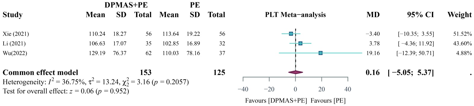 共有3篇文献[16] [21] [25]研究了PLT治疗前后变化水平,各研究之间异质性较小(P > 0.1, I2 = 36.75%),采用固定效应模型进行分析,固定效应模型Meta分析结果显示,DPMAS + PE联合治疗组与单纯PE治疗后PTA相比差异无统计学意义[MD = 0.16, 95% CI (−5.05, 5.37), P > 0.05] (图4)。