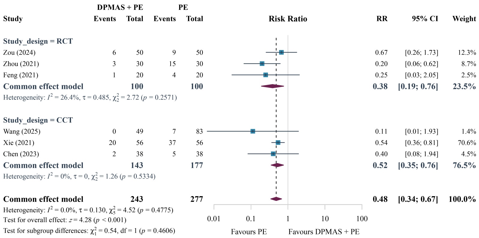 共有6篇文献[10] [12] [15] [16] [20] [22]研究了治疗后不良反应发生情况,各研究之间异质性较小(P > 0.1, I2 = 0.00%),采用固定效应模型进行分析,固定效应模型Meta分析结果显示,相比于单纯PE治疗组,DPMAS + PE联合治疗组能显著降低患者不良反应发生率,差异有统计学意义[RR = 0.48, 95% CI (0.34, 0.67), P < 0.05] (图6)。