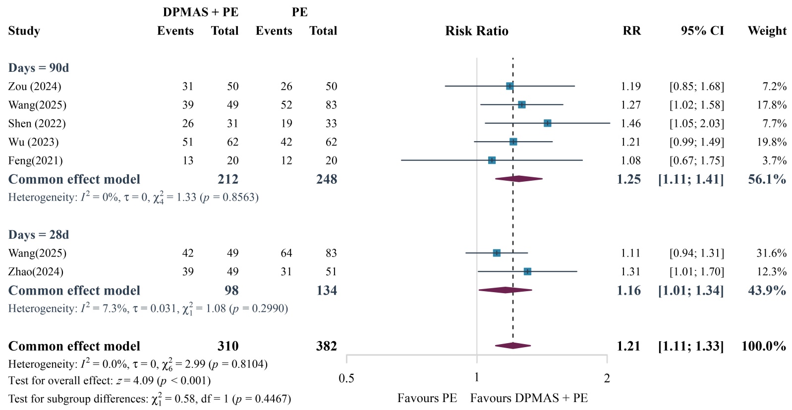 共有6篇文献[10] [15] [17] [19] [20] [23]研究了治疗后患者短期生存率情况,各研究之间异质性较小(P > 0.1, I2 = 0.00%),采用固定效应模型进行分析,固定效应模型Meta分析结果显示,相比于单纯PE治疗组,DPMAS+PE联合治疗组能显著提升患者短期生存率,差异有统计学意义[RR = 1.21, 95% CI (1.11, 1.33), P < 0.05] (图7)。