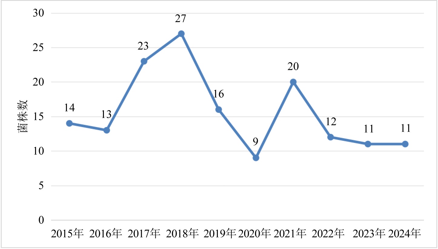采用WHONET 5.6软件进行药敏数据统计分析。使用SPSS 22.0软件进行一般数据分析。计量资料如不符合正态分布,以中位数(P25, P75)表示。计数资料以例数(百分比)表示,组间比较采用χ2检验或Fisher确切概率法。以P < 0.05为差异具有统计学意义。