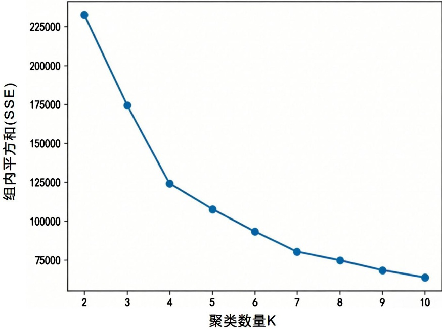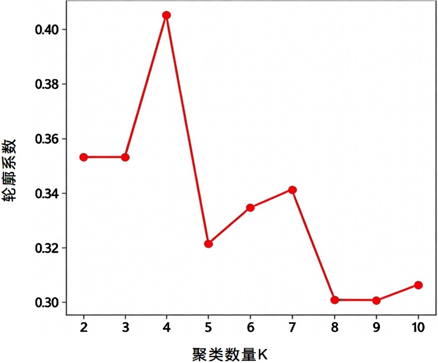 本文首先对R、F、M进行归一化处理,以消除不同指标量纲差异对聚类结果的影响。在此基础上,采用K-means聚类算法对客户进行分类。为合理确定聚类数量,本文结合肘部法和轮廓系数法对不同聚类数下的聚类效果进行评估。得到的肘部法以及轮廓系数法计算过程如图1、图2所示。结果表明,当聚类数取4时,类内SSE随聚类数增加的下降幅度出现明显拐点;同时,在轮廓系数分析中,聚类数为4时对应的轮廓系数达到最大,这也表明该聚类方案具有较好的类内紧密性和类间分离度。因此,综合考虑聚类效果与模型稳定性,本文最终将客户划分为4个聚类,并以4个簇心作为最终的聚类结果。