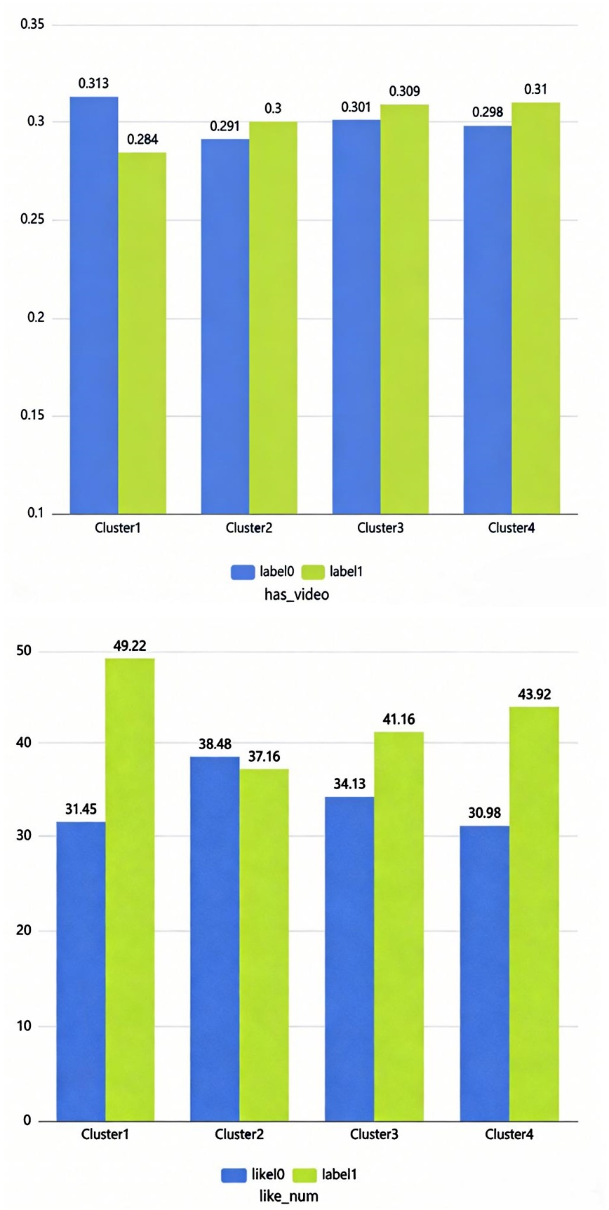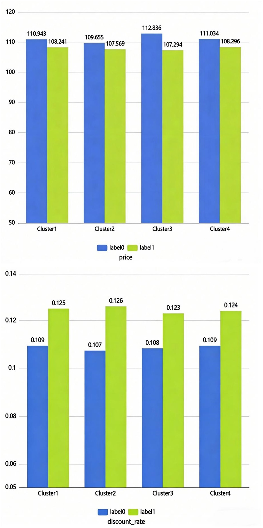 为深入探究不同客户群体的用户行为差异,本文针对不同的用户特征、商品内容以及社交特征进行对比,存在差异的结果如图3所示,label0代表未购买对应产品,label1代表购买了对应产品,第一幅图总体而言客户在决定购买时会一定程度考虑价格因素,价格低的情况下,无论哪种价值类型的客户意愿都会更强。第二幅图可以看出折扣率对购买行为具有明显的正向影响,折扣力度越大,用户更容易产生购买行为,折扣对不同价值等级客户均有效,折扣率并未只对某一类客户“失效”或“过度敏感”。第三幅图,视频内容对购买行为的影响呈现出明显的客户价值分层特征。在最高价值客户群体中,视频展示对购买转化的促进作用并不显著,此类客户的购物行为可能更多依赖于品牌以及历史偏好或者商品本身的质量属性。对于中低价值的客户,已购买用户对应的视频比例显著高于未购买用户,商品主页的视频助于降低信息不对称,提高购买信心。第四幅图中,对于第1、3、4类用户,点赞数越高也就是社交互动力高的购买商品的可能性也越大,结合社交电商的特点,高的社交互动力意味着在该平台有着更高的依赖程度,在社交电商平台中,用户购买决策往往受到他人行为的影响。较高的社交互动水平能够通过社会认同和信任传递机制增强用户对商品的信心,同时丰富的信息交流也有效降低了购买过程中的不确定性。