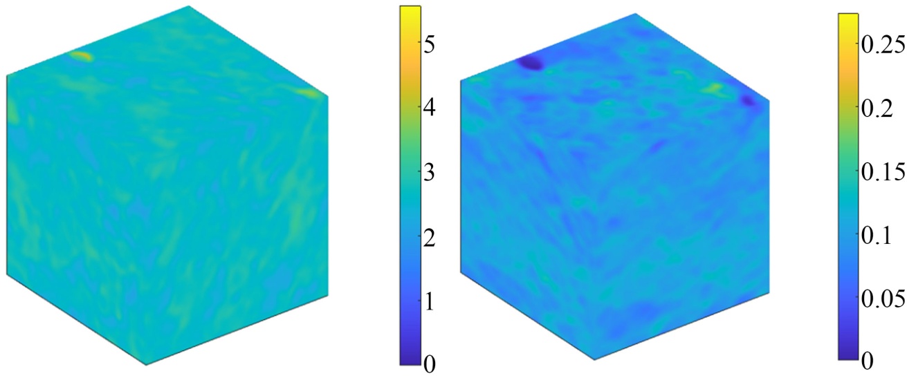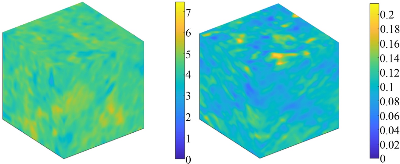 根据XCT图像灰度,可以得到任意像素单元体弹性模量的数学表达式,即红砂岩:E = 162e(−8.0f)以及灰砂岩:E = 124e(−8.7f)。应用有限元方法,在每个单元上施加均匀的工程应变(ε1, ε2, ε3, ε4, ε5, ε6) = (0.1, 0.1, 0.1, 0.1, 0.2, 0.3),依据共轭梯度法历经循环迭代求解满足系统总能量最小值的应力及应变分布,如图5所示、图6所示。根据三维微观结构中所有像素单元体具有的应变张量和应力张量,计算算术平均值获得有效应变〈ε〉和应力〈σ〉,进而依据广义胡克定律确定水泥石整体的有效剪切模量、体积模量、以及杨氏模量。