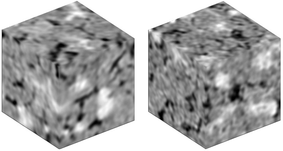 为便于进行XCT测试,进一步从标准试样的中心部位钻取直径8 mm、高度10 mm的样品,再手工打磨至直径4 mm、高度5 mm。岩石样品测试使用的是SKYSCAN 1272型X射线显微镜。对尺寸为直径4 mm、高度5 mm的岩石样品以100 kV的X射线峰值能量和100 μA的电流进行。样品距射线源和探测器分别为60 mm、212 mm。每次扫描获得1200帧二维XCT图像。对岩石样品,每个投影的曝光时间为2.3 s,XCT图像像素的空间分辨率为4 μm。对不同砂岩图像顺序裁取128帧二维XCT图像(512 × 512 μm2),将其重构成三维XCT图像。图1所示为岩石样品的三维XCT重构图像(512 × 512 × 512 μm3),其像素灰度值的变化范围为0~255。