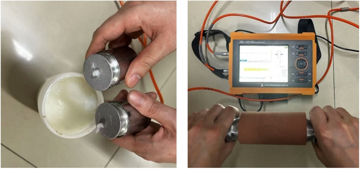 Figure 2. Ultrasonic detector for testing the elastic modulus of sandstones. (a) Sensor and coupling agent; (b) Sample test diagram
