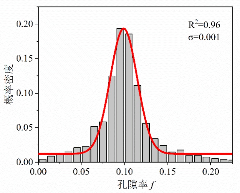 。对本文所考虑两种砂岩样品的微孔隙率分布进行统计分析,发现其具有典型的峰值特征,并呈近似高斯函数,如图3所示。两种砂岩的微孔隙率分布范围基本一致,但红砂岩的微孔隙率分布区间相对集中,灰砂岩则更为分散,这与二者的矿物组成差异(灰砂岩中黏土矿物含量较高)密切相关。
