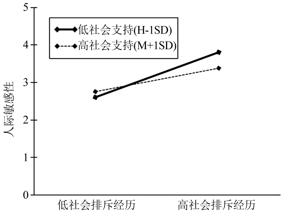 图1. 社会支持在社会排斥经历与人际敏感性之间关系中的调节作用