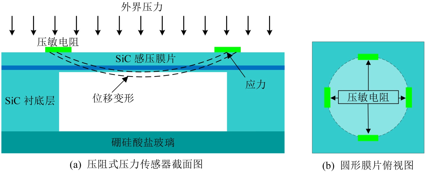 微机电系统(MEMS)是一种微型加工制造技术,可以在半导体材料上加工出微米级大小的传感器芯片。随着相关工艺水平的提升,采用不同的传导机制可将机械信号转变为电信号并进行传输,如压阻式、压电式、电容式等[1]-[3]。压阻式压力传感器是以压敏电阻作为传导机制,通过压力作用在感压膜片上而使其产生形变,进而改变压敏电阻的电阻率,最终根据输出电压结果得出对应压力值的大小。压阻式压力传感器因其体积小、灵敏度高、响应时间短、制造简单等优点,广泛应用于汽车、航空航天、医疗器械等领域[4] [5]。