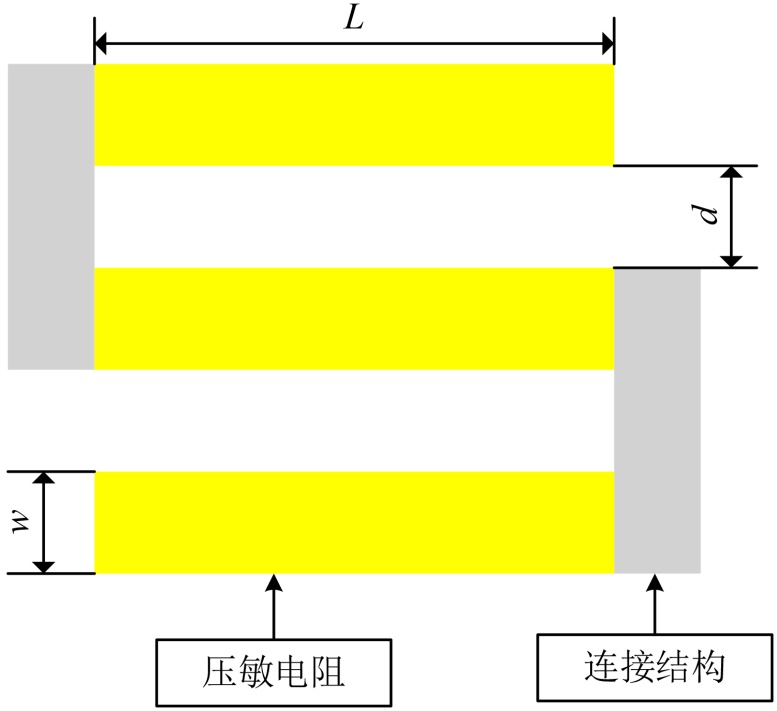 采用弹簧形压敏电阻可以使电阻率变化更加明显,有利于优化压阻式压力传感器的输出性能。如图3所示,这项工作采用了“S”形双匝压阻结构。压敏电阻的总长度为150 µm,宽度为10 µm (w),厚度为2 µm。压敏电阻被分成3个50 µm (L)长的压敏电阻段,中间以10 µm (d)的间隙隔开,并将它们串联连接。压敏电阻的掺杂浓度为1.38 × 1019 cm−3,对应于图3中的黄色区域。连接材料硅对应于图3中的灰色区域,用作电路的互连介质。