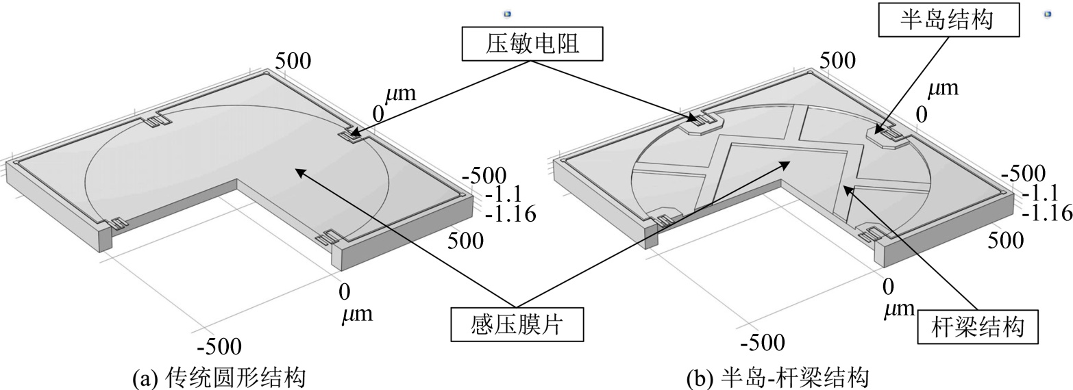 传统圆形结构和半岛–杆梁结构的压阻式压力传感器如图4所示。对于半岛–杆梁结构而言,压敏电阻沿膜片的边缘放置在半岛形结构上,形成局部高应力区。这种设计策略保证了传感器在高压环境下的可靠性能和精度,有助于更均匀地分布应力,并避免过度变形。压力传感器的三维结构通过COMSOL Multiphysics软件在0~10 MPa范围内进行仿真分析,用于模拟和分析的传感器参数如表3所示。