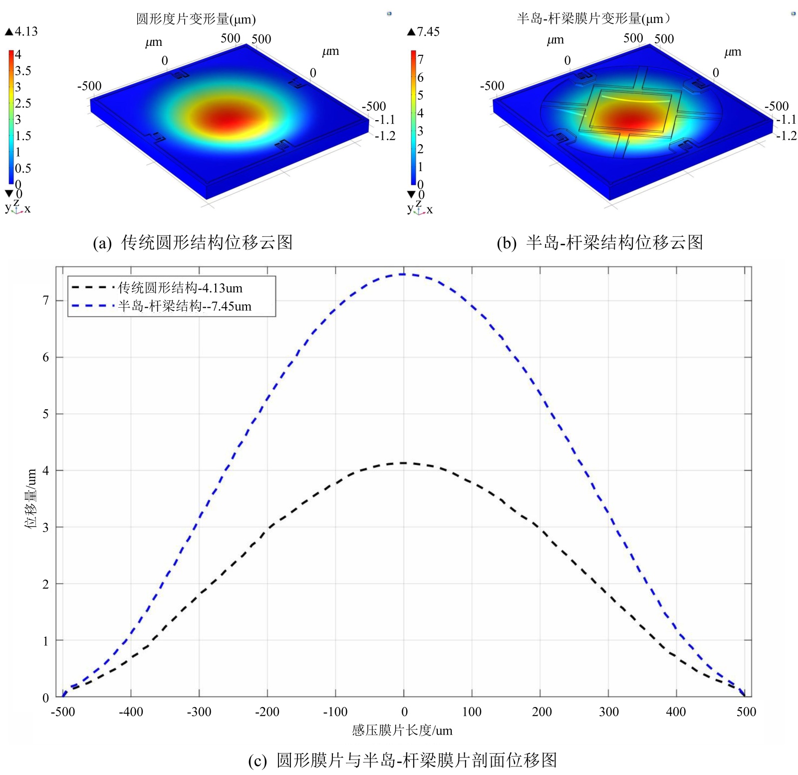 通过COMSOL Multiphysics软件在0~10 MPa范围内以1 MPa的步长进行了仿真分析,得到了半岛–杆梁结构和传统圆形结构膜片挠度的变形结果如图5所示。其中,网格是通过COMSOL Multiphysics内置的自适应网格模块实现,采用自适应非结构化线性四面体网格,并将压敏电阻、膜片边缘和半岛杆梁连接的局部区域进行网格细化处理。图5(a)和图5(b)中的仿真云图显示,半岛–杆梁结构和传统圆形结构的最大挠度出现在膜片的中心,幅度分别为7.45 µm和4.13 µm,并且向边缘逐渐减小。图5(c)显示了在10 MPa的压力下,传统圆形结构和半岛–杆梁结构沿穿过膜片中心区域的位移曲线图。