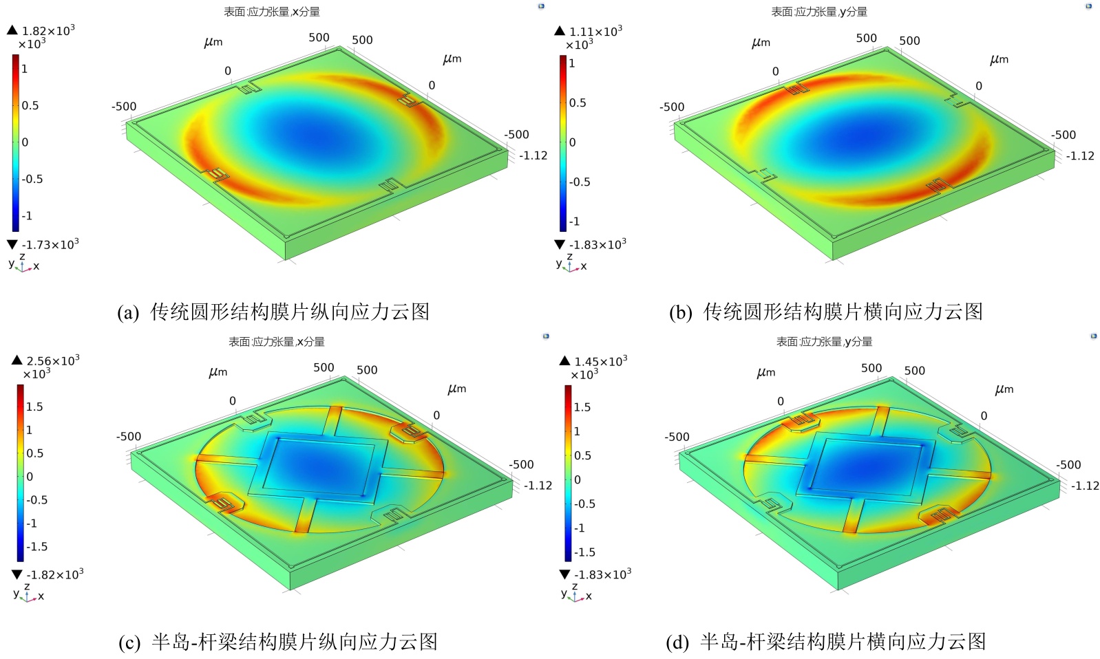 膜片表面的纵向应力和横向应力可分别表示如下[11]: