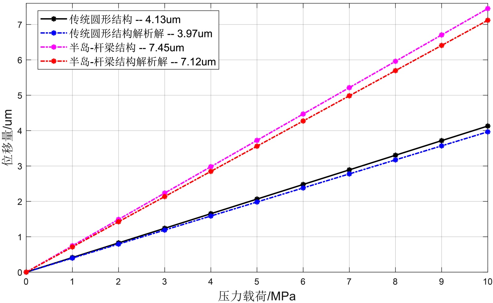 通过COMSOL Multiphysics软件在0~10 MPa压力范围内分析传统圆形膜片和半岛–杆梁膜片的变形结果,并与传统圆形膜片的解析公式(3)和半岛–杆梁结构的解析公式(11)所得的计算结果进行比较。仿真分析可得传统圆形结构和半岛–杆梁结构感压膜片的最大位移量分别为4.13 µm和7.45 µm,从解析方程(4)和(11)可以推导出,传统圆形结构和半岛–杆梁结构中膜片的理论位移分别为3.97 µm和7.12 µm。传统圆形结构的挠度变形、传统圆形结构的解析解、半岛–杆梁结构的挠度变形和半岛–杆梁结构的解析解的比较结果如图8所示,以上四种变形结果都小于感压膜片厚度的五分之一。感压膜片的仿真结果与理论分析结果较为一致,表明传感器结构设计与预期结果相符。模拟和分析结果之间的高度相关性证实了所采用的建模策略的准确性,误差小于4.6%。