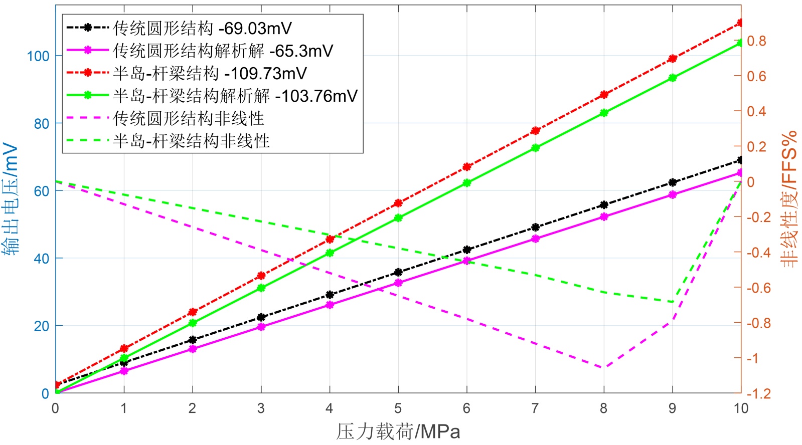图9. 不同膜片结构的输出电压与非线性度的结果图