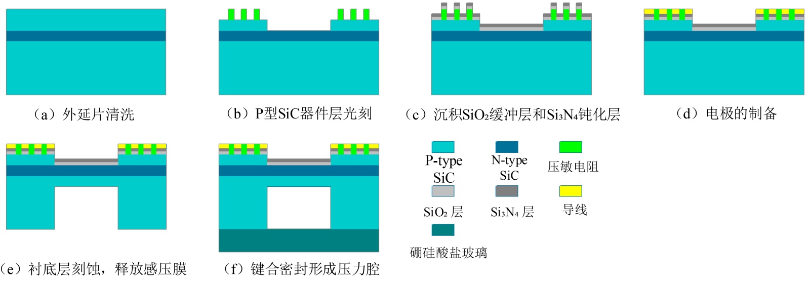 (a) 首先选择P-N-P型SiC外延片,对晶片进行标准清洗,去除表面的自然氧化层。(b) 对P型SiC器件层进行光刻,旋涂光刻胶并曝光(定义压敏电阻和半岛–杆梁结构的图形),显影并烘干。采用ICP-RIE刻蚀(蚀刻气体:SF6/O2,功率300 W,压强5 Pa),蚀刻深度至目标尺寸后,剥离光刻胶形成压阻元件和半岛–杆梁结构。(c) 使用化学气相沉积法在SiC外延晶片的表面上沉积SiO2缓冲层和Si3N4钝化层。(d) 通过光刻定义电极窗口图形,采用RIE分两步刻蚀(先以CF4/O2蚀刻SiO2,再以CHF3/O2蚀刻Si3N4),并且通过磁控溅射沉积金属层,退火后剥离多余金属结构,完成电极图形化。(e) 采用DRIE蚀刻P型SiC衬底底部(蚀刻气体:SF6/Ar,功率500 W,压强8 Pa),蚀刻深度200 μm,以释放感压膜片并形成压力腔。(f) 采用等离子体活化键合(PAB)技术,将SiC外延片与硼硅酸盐玻璃键合,实现压力腔的密封。